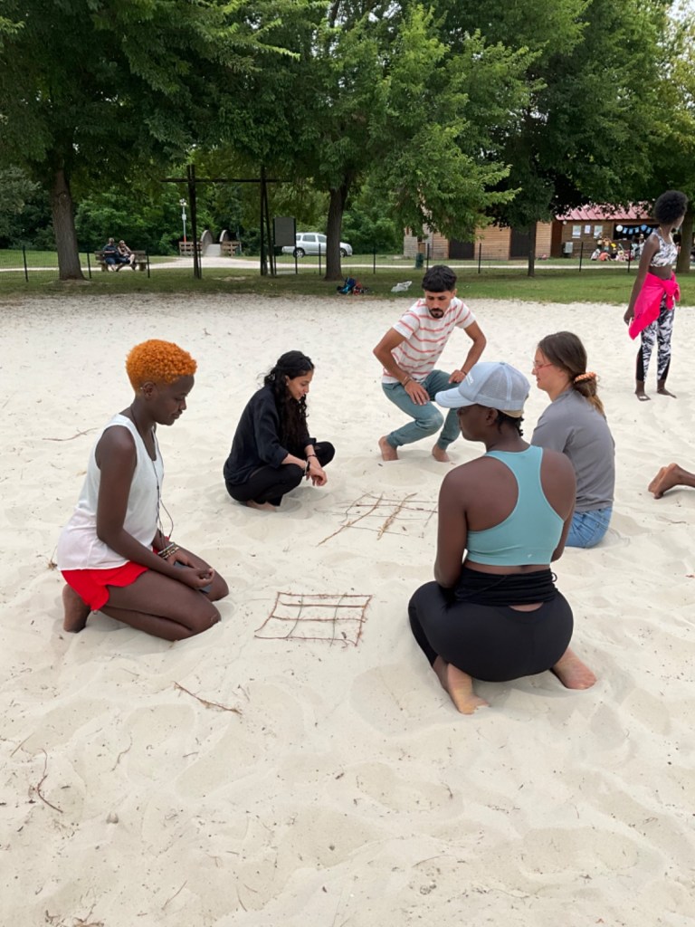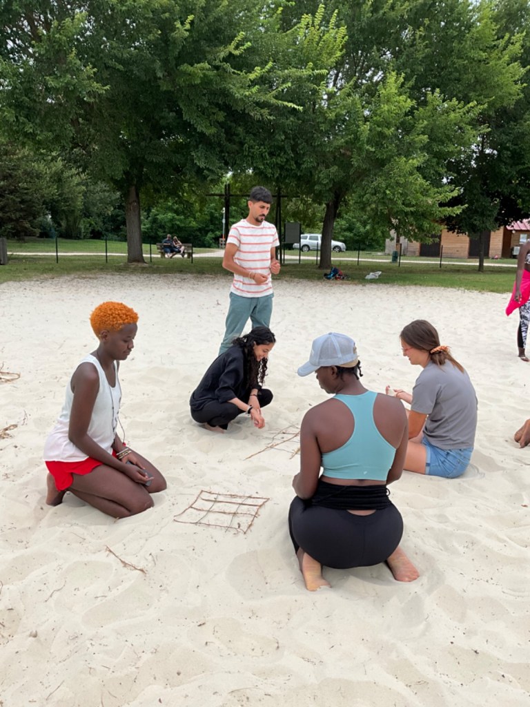 L’entrée dans la formation au travers ses propres jeux d’enfance a permis à chacun•e de facilement appréhender l’animation d’un groupe. Cela rappelle également la dimension universelle du jeu puisque plusieurs d’entre eux présentent des similitudes dans leurs règles et objectifs. L’approche ludique et pédagogique a permis à chacun d’entrer dans l’univers du jeu pour mieux progresser. Des moments de réflexion en groupe ont également été organisés pour approfondir la théorie du jeu, avant de se confronter à la pratique en animant eux-mêmes différentes activités, faisant ainsi face aux défis et aux imprévus que cela pouvait comporter. Des petits groupes ont ensuite animé des séquences sur des grands jeux collectifs comme le baseball, le jeu des 4 coins ou encore sur un classique mais très efficace Poule-Renard-Vipière.