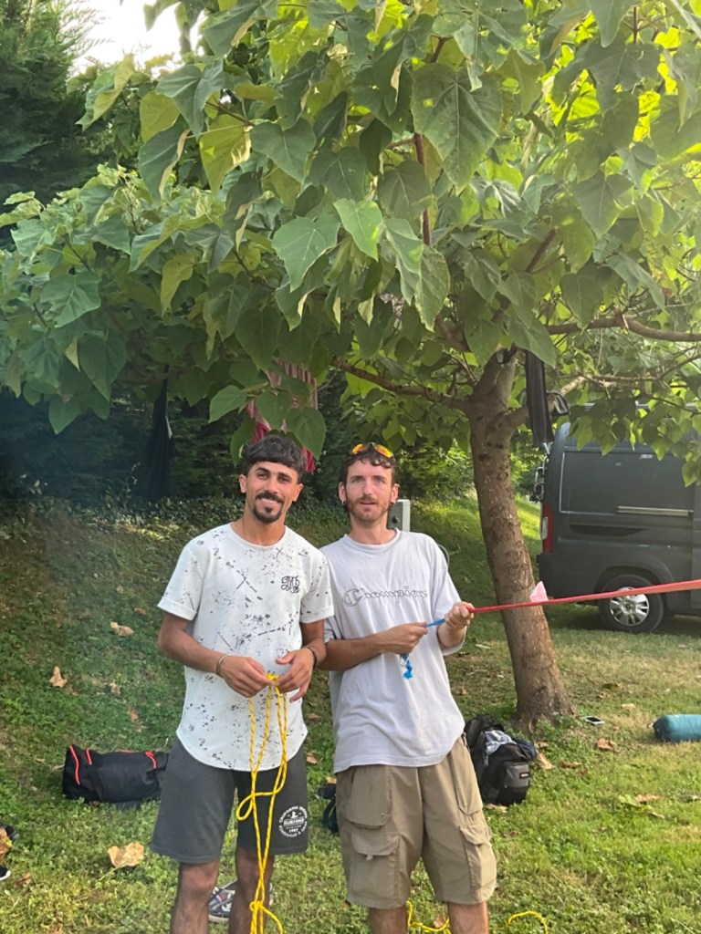 En effet, le premier défi est de créer une véritable cohésion de groupe, de rapprocher les gens pour leur permettre de s’investir plus facilement dans une dynamique de participation active. Le séjour est centré sur la formation des participants à pouvoir animer une activité, seul ou en binôme et à l’adapter en cas de difficultés (par exemple des règles trop lourdes, des participants qui pourraient être réticents ou qui n’arriveraient pas à participer, un manque de matériel, etc…). Pour cela, il était important de casser la barrière de la timidité entre les participants et malgré celle de la langue, la formule camping a eu le mérite de relever parfaitement ce défi ! La vie collective en camping, l’installation du camp, son amélioration pour plus de confort et la mise en place d’équipes tournantes en charge des courses, du repas, de la vaisselle ont fortement contribué à cet objectif !