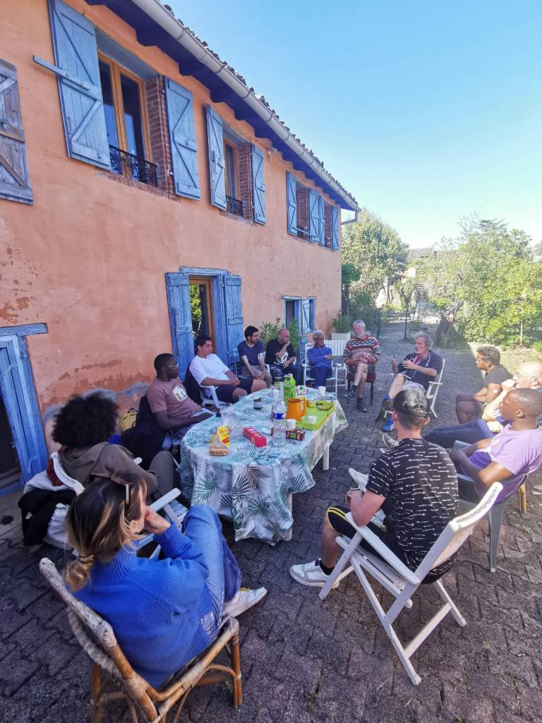 Le dĂ©part s’est fait Ă midi de la Patte d’Oie, oĂč nous avons pris le bus direction la campagne et le soleil ! Ă l’arrivĂ©e, nous avons Ă©tĂ© accueilli.es autour d’un cafĂ© et nous nous avons pris le temps de se prĂ©senter. Yves a ensuite diffusĂ© un film rĂ©alisĂ© par la FSGT qui traite de l’organisation d’activitĂ©s sportives en Palestine. Un moment fort sur lequel chacun a pu s’exprimer, et s’exprimer sur les dĂ©tails marquants du film.